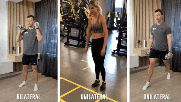 Exercițiile pot fi executate bilateral, când folosești ambele membre superioare/inferioare, sau unilateral, când le folosești pe rând. Ca de exemplu genuflexiunea clasică în care cobori folosind ambele picioare, fiind un exercițiu bilateral, în comparație cu genuflexiunea pe un picior, fiind versiunea unilaterală a acesteia. Fiind atât de dificilă genuflexiunea pe 1 picior, și doar cei mai avansați fiind capabili să o facă, putem la considera la fel de bine fandările ca fiind o alternativă mai accesibilă pentru picioare.